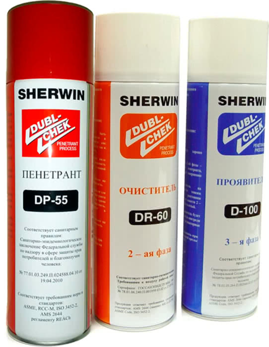 Набор Sherwin один из самых удобных наборов для проведения цветной (красно-белой) дефектоскопии при стандартных температурных условиях от +10°С до +50°С. Набор включает в себя три аэрозольных баллончика емкостью 500 мл: пенетрант DP-55, очиститель DR-60 и проявитель D-100.