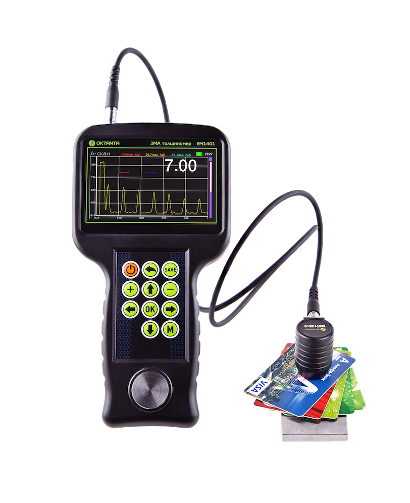 Толщиномер EM1401 UT имеет цветной дисплей, защищённый ударопрочным стеклом. EM1401 UT использует специальный алгоритм обработки данных, который позволяет корректно измерять толщину в автоматическом режиме при наличии мешающих факторов, таких как анизотропия металла, наличие нескольких отражателей, наличие внешних помех. Помимо автоматического режима измерения толщины прибор позволяет использовать ручные режимы измерения по первому эхо-сигналу и по разности между любыми двумя эхо-сигналами. Ручной режим рекомендуется использовать на сильно корродированных объектах.